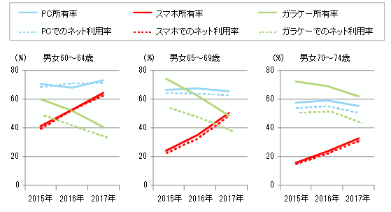 一方、従来の携帯電話である「ガラケー」は、「60〜64歳の男女」で約40%、「65〜69歳」で約50%、「70〜74歳」で約60%に低下しています。